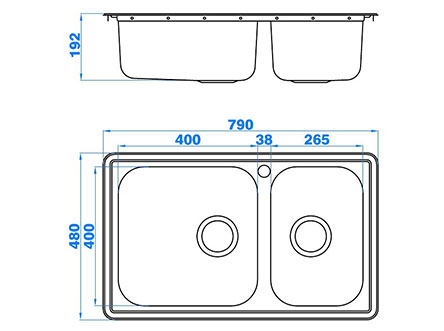 型號:665款式:雙盆安裝方式:嵌入式總尺寸:790*480 mm大盆:400*400*192 mm小盆:265*400*192 mm