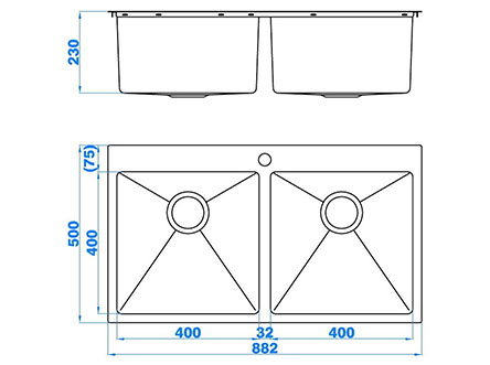 型號:5424款式:雙盆安裝方式:嵌入式總尺寸:882*500 mm雙盆:400*400*230 mm
