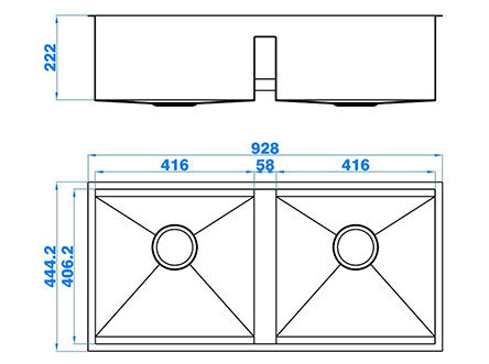 型號:5159款式:雙盆安裝方式:臺底式總尺寸:928*444.2 mm雙盆:416*406.2*222 mm