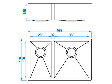 型號:710RY款式:雙盆安裝方式:嵌入式總尺寸:692*450 mm大盆:380*400*185 mm小盆:230*400*185 mm