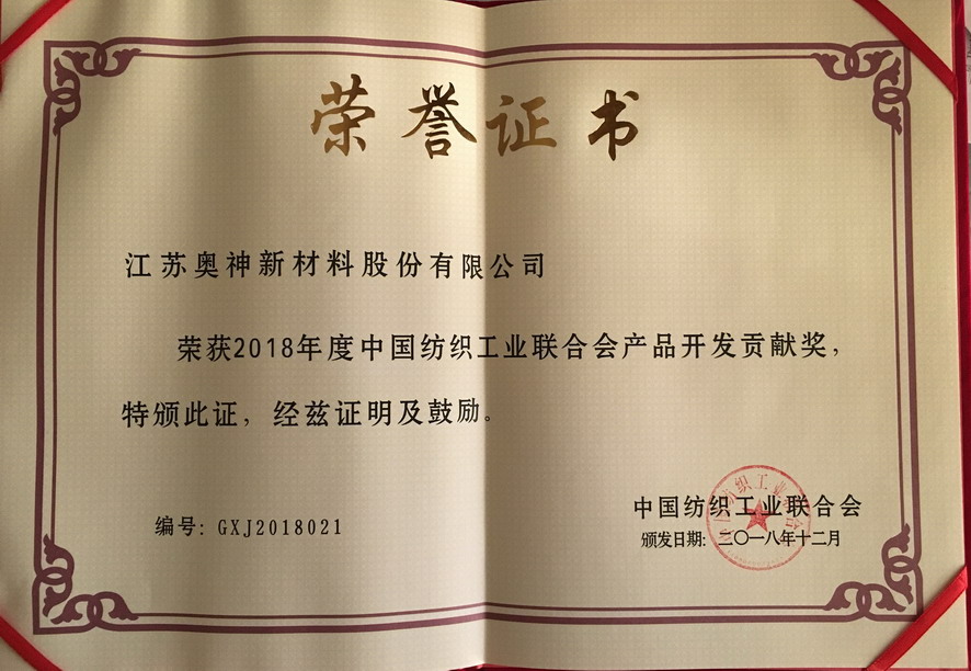 近日,在北京召開的2018年中國紡織創新年會上,江蘇奧神新材料股份有限公司獲得中國紡織工業聯合會頒發的“2018年度中國紡織工業聯合會產品開發貢獻獎”榮譽稱號。