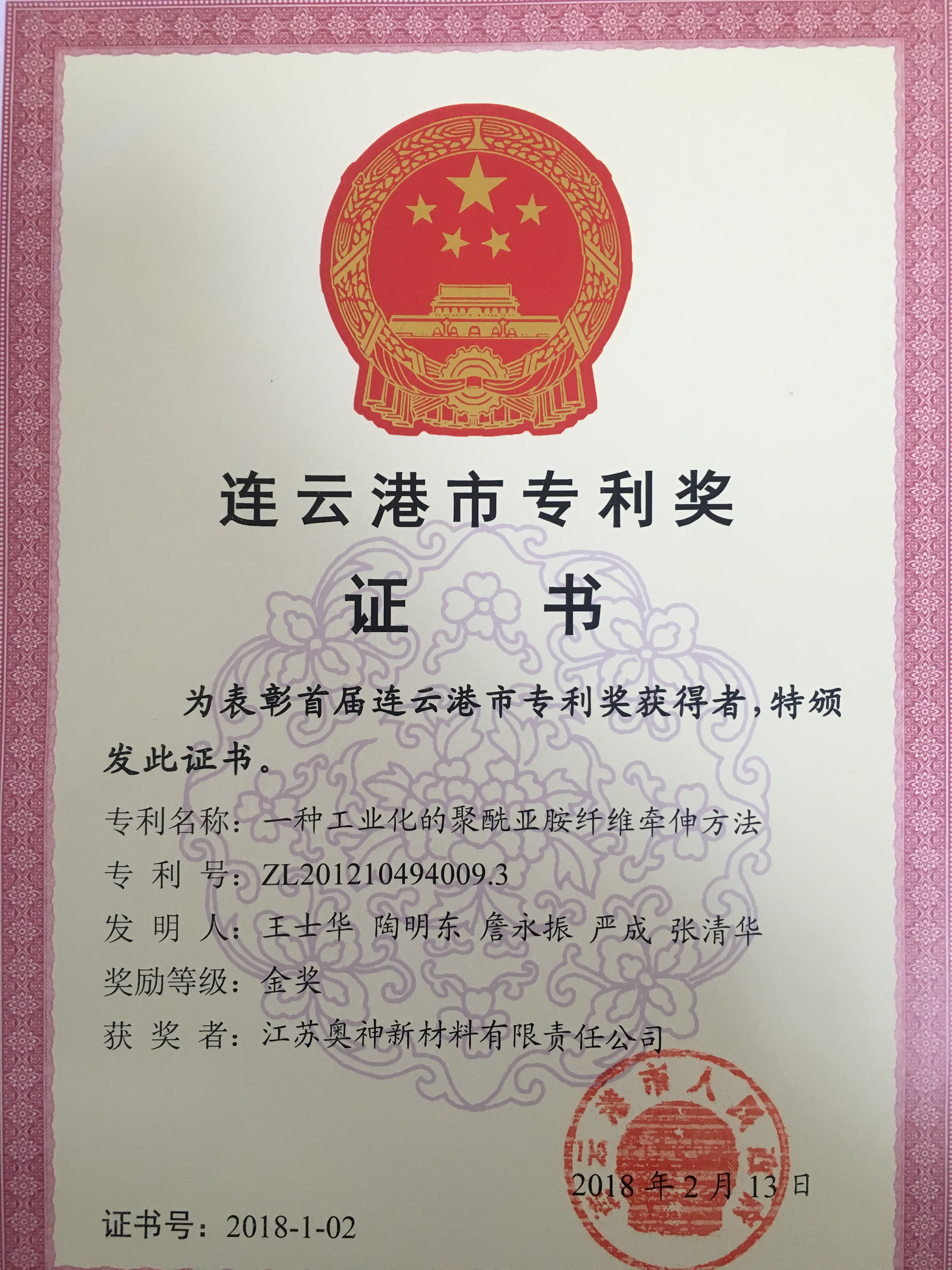 近日,奧神新材料公司“一種工業化的聚酰亞胺纖維牽伸方法”專利喜獲首屆連云港市專利獎金獎。
