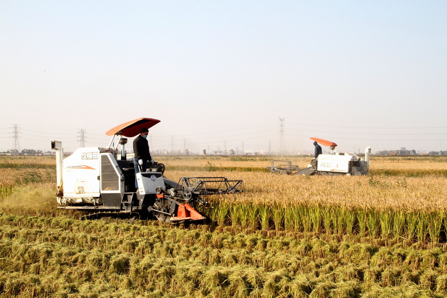 11月1日下午,連陰后地放睛氣溫明顯回升,鹽田稻花香,稻谷歸曬場,銷售訂單忙。在青口公司大新農(nóng)場的一分場趙斯凱的條田,兩臺收割機(jī)來回穿梭,一片繁忙的景象,全公司近二萬畝水稻開始收割。