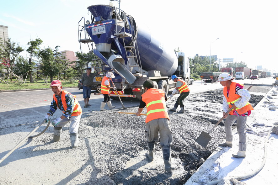 在大港路“新光路至零公里”路段,筆者在水泥路上看到一塊塊被切割成方方正正的凹面,四周都架好防護欄等安全防護設施,在華東城北門偏東不遠處,一臺挖掘機的鏟斗被換上沖擊破碎錘,正在一大塊破損的水泥路面沖擊破碎作業,“嗒嗒嗒”的沖擊聲十分震耳。在與現場作業的盛達市政公司市政維修項目部副主任史如勤交流中得知,該路段是附近集團箱基站進出港口集裝箱車輛的重要通道,每天有好幾百輛集裝箱車輛進出,水泥路面不堪重負,損壞比較嚴重,根據開發區創衛工作要求,由他們對該路段破損處進行局面分割維修,整個路段維修面積達到5000多平方,為保證道路使用通行,采取半幅維修、邊破碎邊澆灌的方式,保證施工進度,現正在維修北側路面,整個路面維修計劃在8月底完成。“因為創衛,我們下一步還要對轄區內的破損、歪到的路牙石進行維修扶正,242路段瀝青破損路面維護,還要開通四處道口,而現在事多人少,人手比較緊張,我們周六周日都沒有休息,就是想把創衛工作任務一項一項地及時完成,決不能拖創衛工作后腿。”他邊說邊用肩上的毛巾擦著額頭上的汗水。