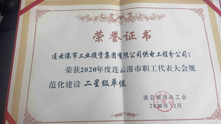近日,供電公司榮獲市總工會頒布的2020年度連云港市職工代表大會規范化建設二星級單位。