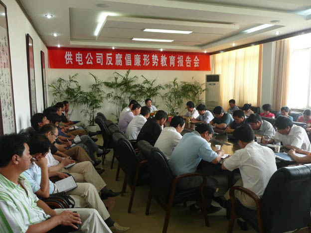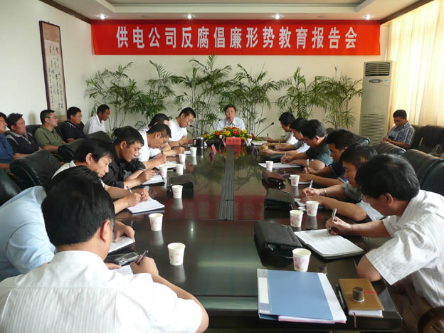 近日,我公司邀請了市紀委常委、市紀委秘書長、市監(jiān)察局副局長雷生保同志來我公司作反腐倡廉形勢教育報告,公司領導、機關中層干部、各供電所領導班子及部分職工代表參加了會議。