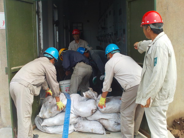 總指揮長宣布演練開始后,變電所值班工及相關人員迅速拿出搶險儲備物資:潛水泵、編織袋、鍬、銑等,按照各自分工,編織袋裝泥壘起攔水防線,潛水泵向防線外迅速抽水,直至災情全部控制為止。通過應急演練,切實提高了汛期突發事件的應急處理能力。(馬德松)