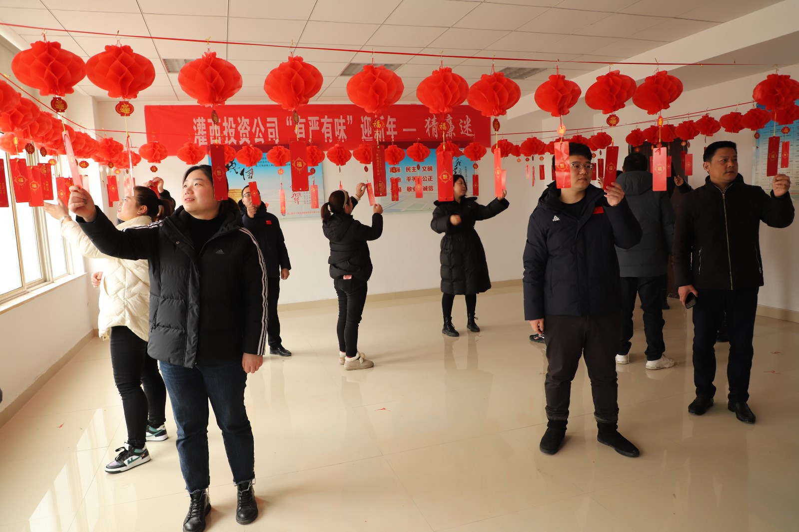 “樹我中華廉政風——打我國兩節氣。”“反腐倡廉常抓不懈——打一中國地名?!?月27日,灌西投資公司辦公大樓廉政文化展廳內紅紅的燈籠格外喜慶,近百條廉政燈謎依次懸掛,一場集知識性和趣味性于一體的廉政燈謎有獎競猜活動吸引了百余名員工聚集參與,大家一起開動腦筋,爭相“解密”。