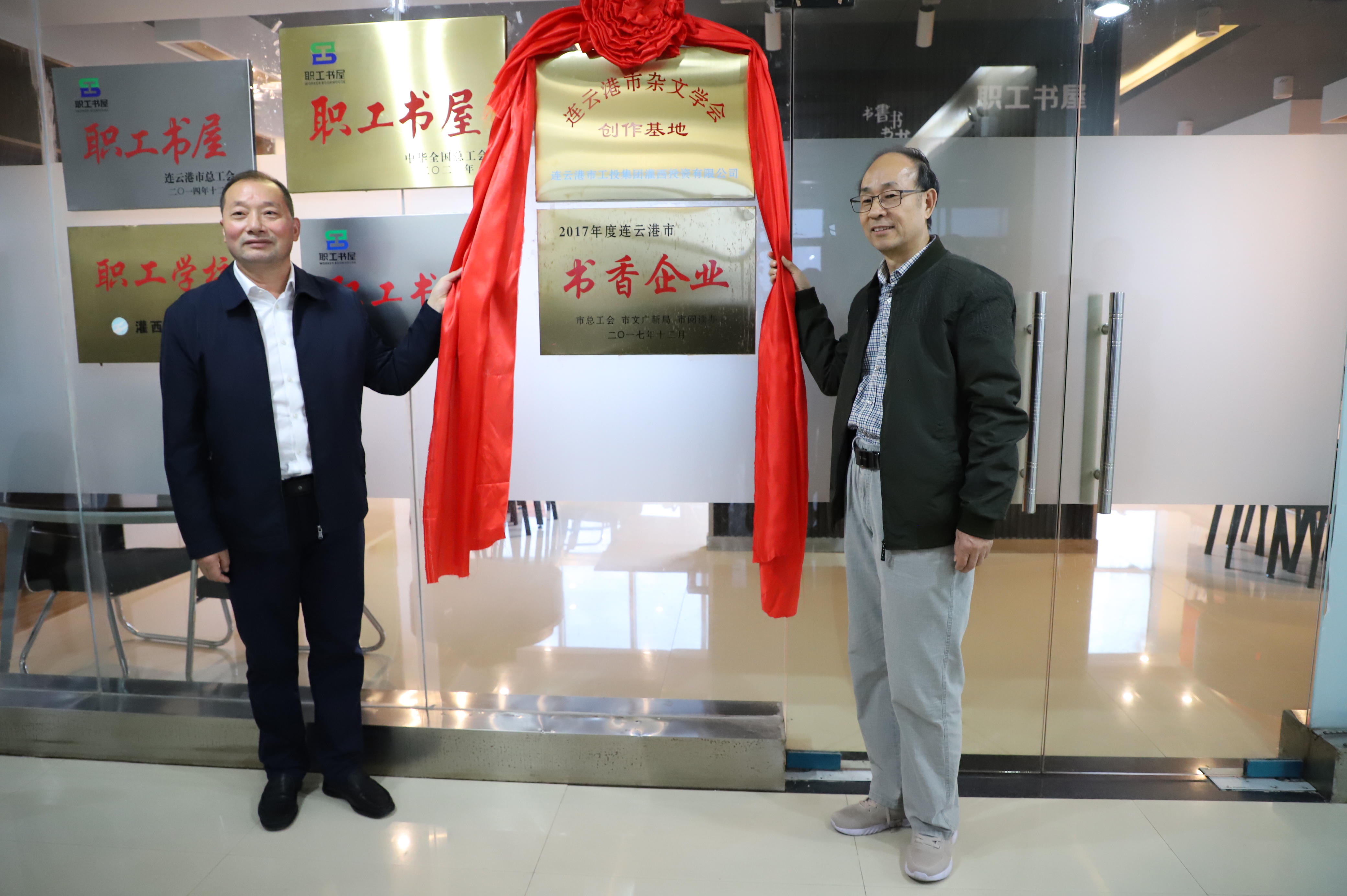 11月3日,連云港市雜文學(xué)會(huì)創(chuàng)作基地掛牌儀式在灌西投資公司職工書屋舉行,市雜文學(xué)會(huì)會(huì)長(zhǎng)李正冬一行為灌西公司授牌,公司黨委書記、董事長(zhǎng)、總經(jīng)理李國(guó)文,黨委副書記、工會(huì)主席王宏等參加掛牌儀式。