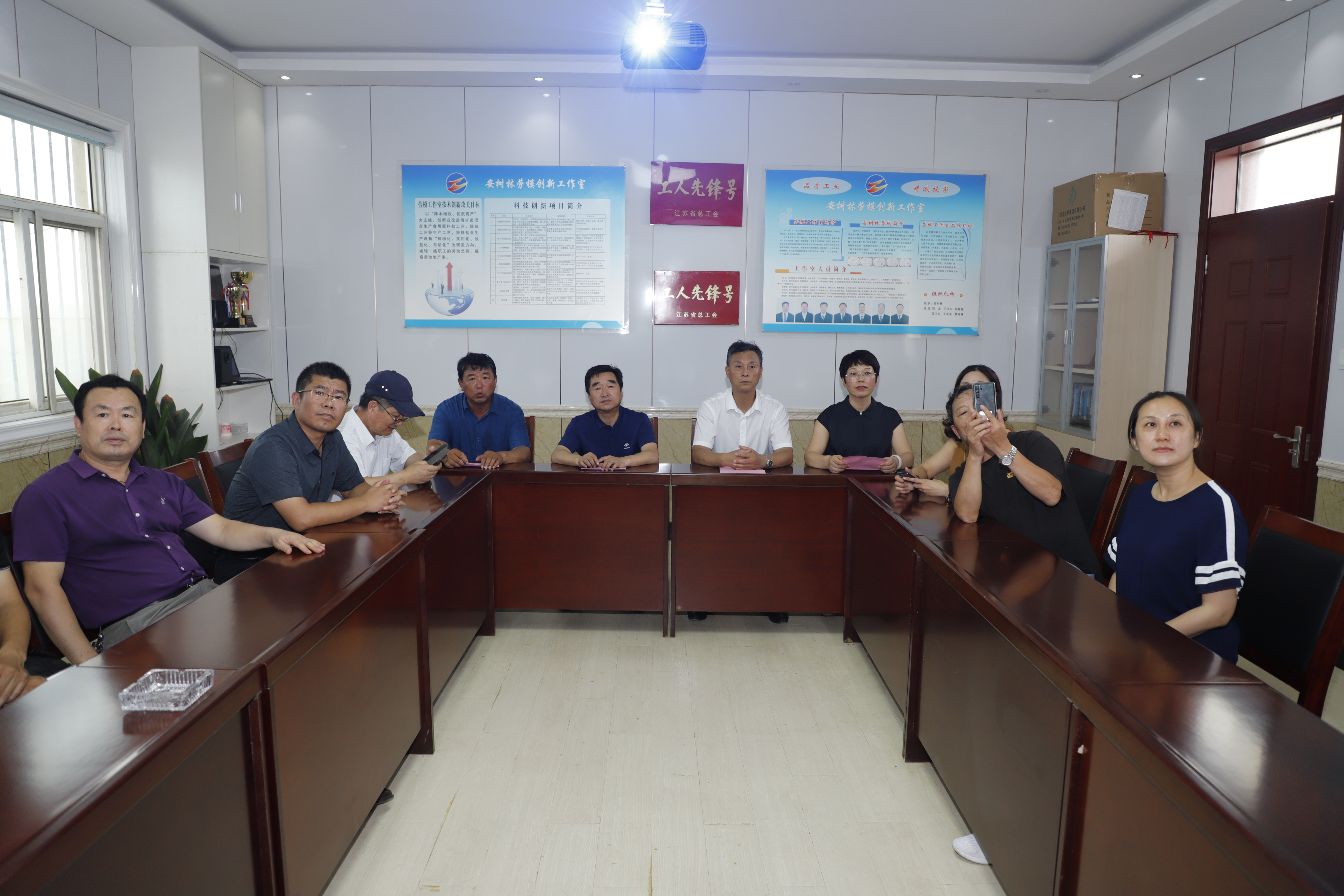 隨后,在安樹林勞模創新工作室,王盡美研究會一行觀看了江蘇省工人先鋒號“安樹林勞模創新工作室技術創新成果展示”宣傳片。參觀了有百年歷史的連云港市文物保護單位“公濟公司舊址”。公濟公司的前身叫濟南鹽場,始建于1911年,公司駐地舊址在今灌西中二圩路北點415號。這一建筑群座北朝南,整體呈正方形。西側是輔助用房,東側是兩個獨立的三合院,中間則是日字形四合院。建筑群占地約500平方米,有房屋30余間。面對已經百年的老建筑,一行人員議論起當年王盡美來到連云港市對鹽業工運活動的影響,并認為對公濟公司歷史的研究,有助于對淮鹽文化歷史的了解。(西宣)