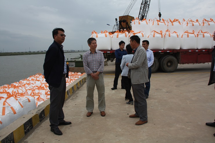 在五灌河碼頭現場,宵洋物流公司工人正忙于裝卸作業,將車輛上化工產品噸袋物資吊裝下船艙,喻振東副局長一行首先到碼頭現場視察碼頭的生產建設情況,隨后到投資公司三樓會議室進行了座談。