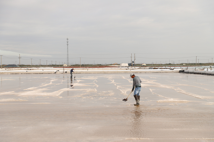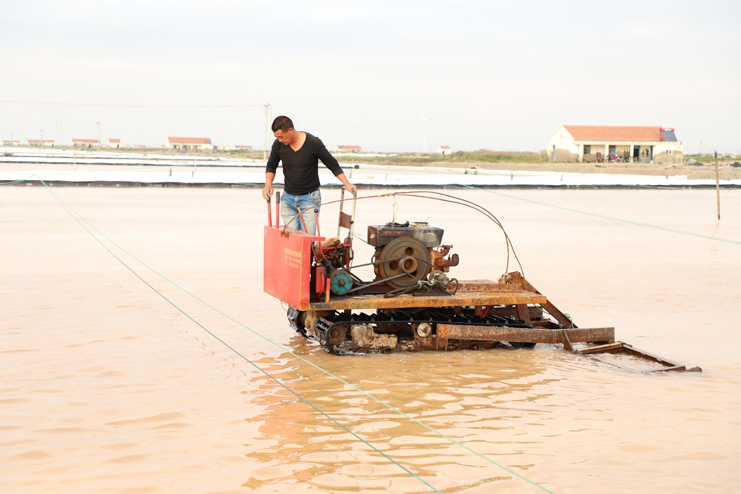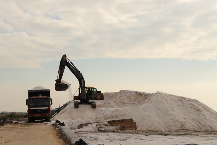 6日下午,在新河制鹽分公司的十二班,扒鹽機組正在扒鹽,在不遠處鹽池內,集鹽機械正在鹽池內緩緩移動集鹽,鹽泵運轉不停,輸鹽上廩,鹽廩上兩名大廩工正在不停筑廩。鹽池內,有的員工對破碴作業機械進行修理,有的員工在整平扒過鹽的格塊,有的員工在活碴。筆者從該班班長徐正好處了解到,該公司5號就開機扒鹽了,下半年以來,十二班已經扒鹽7000余噸。在新河制鹽分公司的十一班,班長葛高劍正帶領員工裝運大廩布,做好扒鹽的準備工作;在埒南制鹽分公司的九班,機聲隆隆,一名員正開著活碴機械在鹽池內作業,不遠處有幾名員工正用土工布叉格埝,對灘場進行維修亮化;八班有一臺挖掘機正在鹽廩旁給裝鹽車輛上鹽……,日曬制鹽公司鹽灘上到處都活躍著職工們忙碌的身影。
