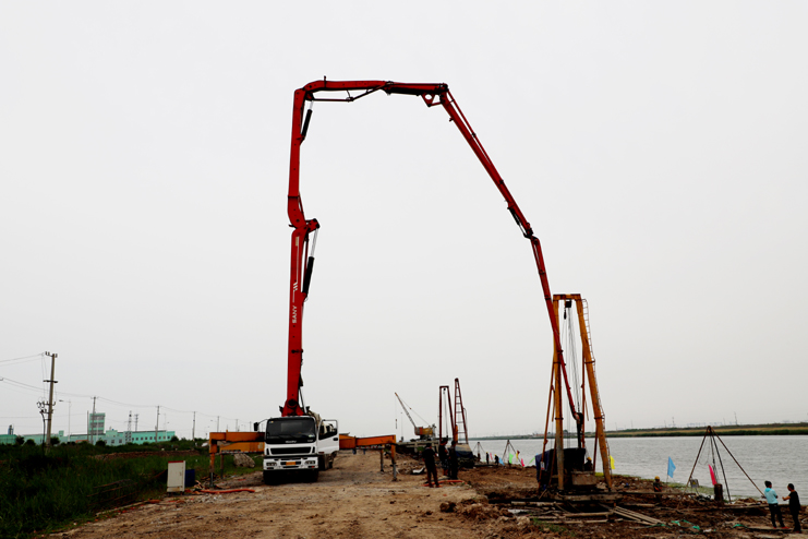 5月30日下午,藍色的天空沒有一絲云彩,火熱的太陽炙烤著大地。在灌西投資公司五灌河碼頭擴建項目建設工地,施工人員正在各司其職的工作著,有的在使用電鋸,有的在壓鋼筋,還有的在焊接鋼筋框架。遠處一臺混凝土澆灌機在進行混凝土澆灌作業,碼頭岸邊大小打樁機器一字排開,筆者親身感受五灌河碼頭二期工地開發建設的火熱場面。