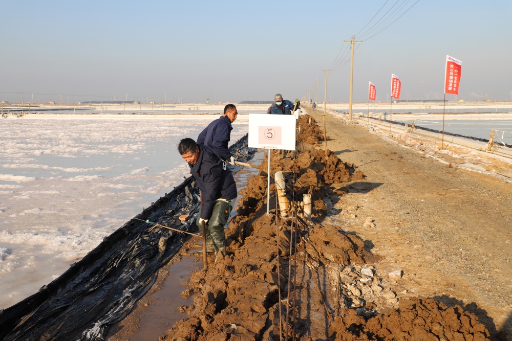 寒冬時(shí)節(jié),暖陽(yáng)之下,鹽廩之旁,曬得黝黑的鹽場(chǎng)產(chǎn)業(yè)工人們按照競(jìng)賽的考核標(biāo)準(zhǔn),做熟泥、打堰墻、做堰頂,護(hù)埝頂、夯埝坡、清塘底,見(jiàn)證了一場(chǎng)技能比拼的盛會(huì)。經(jīng)過(guò)一天的鏖戰(zhàn),潘成軍師徒取得了池堰修整第一名;董治波師徒取得了土塘清淤第一名。(西工)