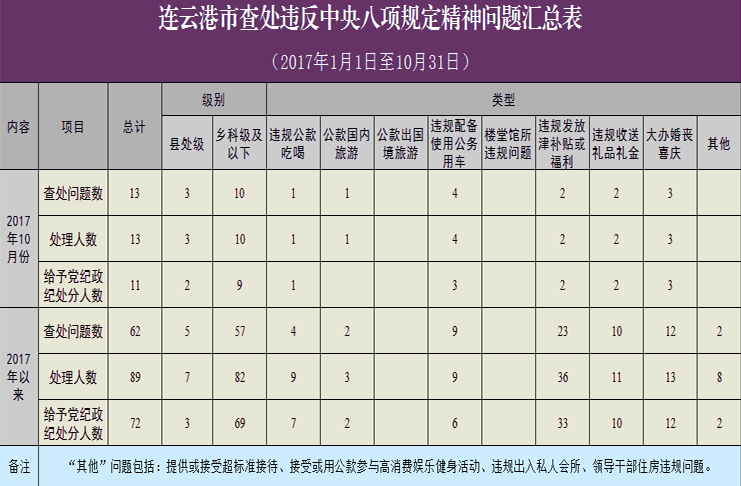 為進一步貫徹落實中央八項規定精神,連云港市紀委建立了落實中央八項規定精神情況月報制度。2017年1月1日至10月31日,全市查處違反中央八項規定精神問題情況如下:
