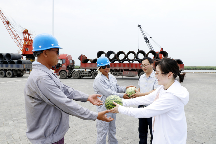 入伏以來,氣溫持續攀升,五灌河碼頭裝卸工作也迎來了夏季高溫的“烤驗”。為做好高溫酷暑期間的防暑降溫工作,確保職工工作安全和身心健康,7月25日,灌西工會一行到宵洋五灌河碼頭為堅守在崗位上奮戰的碼頭工人送去關懷和問候。 高溫籠罩下的碼頭暑氣蒸騰,灌西工會為碼頭工人送來了西瓜、白糖、綠豆、藥品等防暑降溫物品。并叮囑職工們要注意安全生產,做好防暑降溫工作。(張明建)