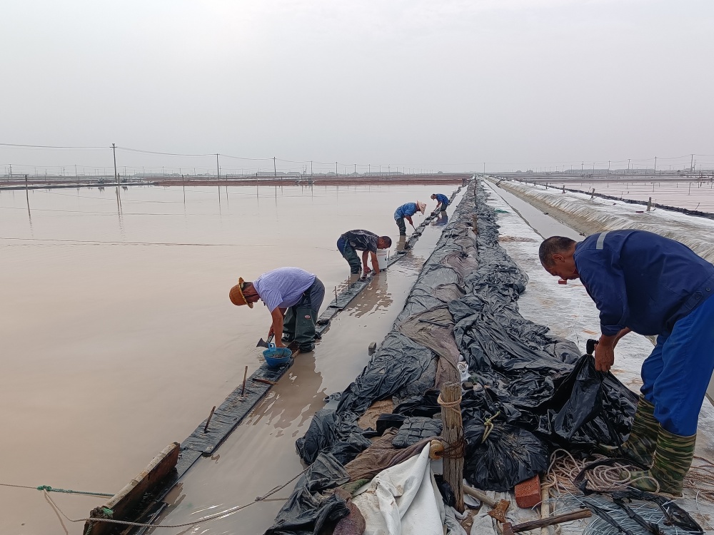 新河制鹽分公司統(tǒng)一安排和調(diào)配,利用夏季短晴天期間、打時間差的方式,對各班組塑布進(jìn)行更換更新。班組人員有的加固浮板,有的釘釘子,有的拆裝鐵釘,有的制作擋浪布小站樁。乒乒乓乓的敲打聲不絕于耳,一派忙碌景象,為確保原鹽生產(chǎn)能安全度過雨季打下堅實(shí)基礎(chǔ)。(新河黨支部)