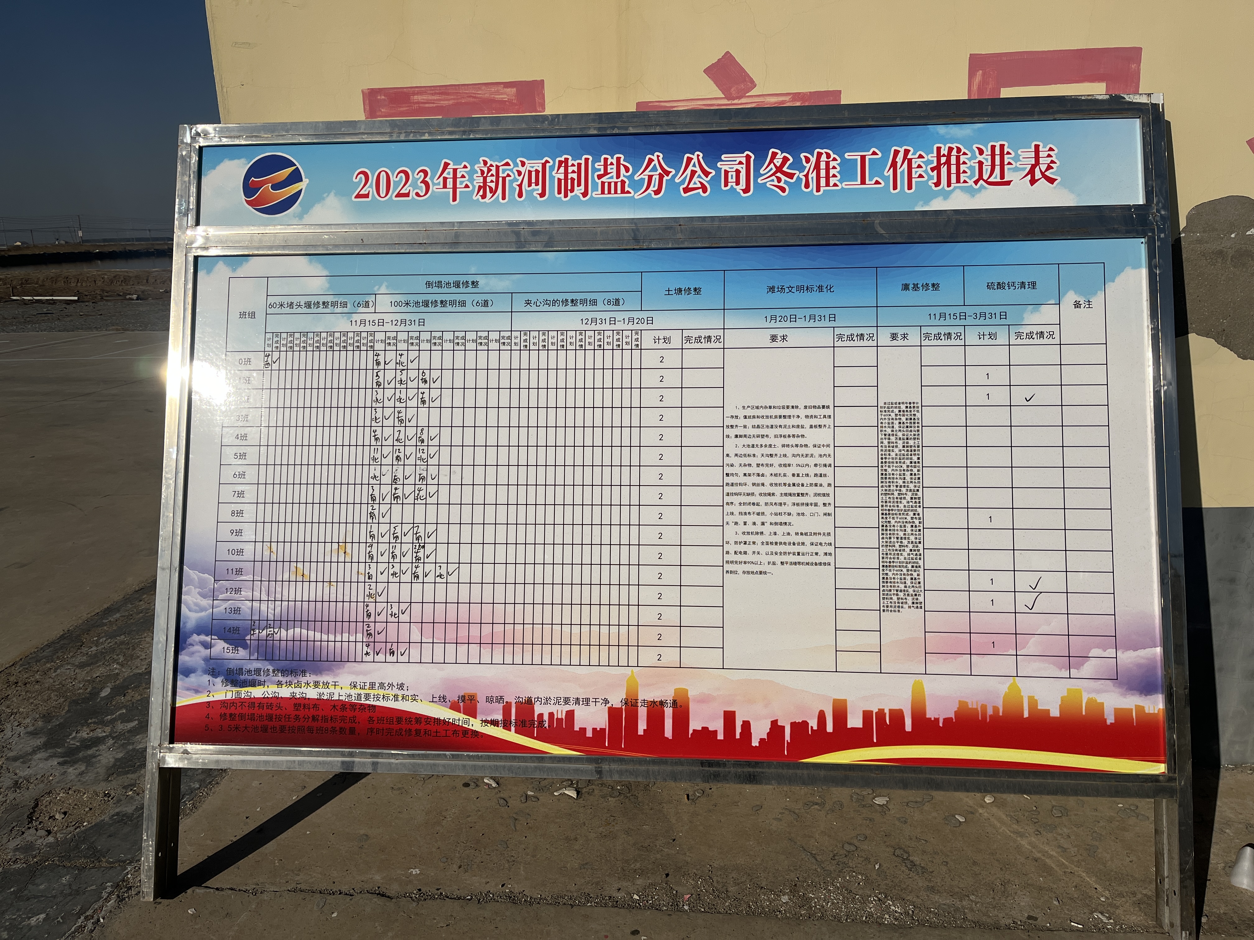 本次冬準工作共有六大項內(nèi)容,圖表包含了冬準詳細的工作計劃,通過觀看此表可以清晰的了解到公司各班組的冬準進度。公司要求廣大黨員要以黨的二十大精神為引領(lǐng),進一步發(fā)揮好黨員的先鋒模范帶頭作用,立足崗位率先垂范作標桿;重點抓好硫酸鈣沉積嚴重班組清理工作,制定計劃和方案,為冬季冷凍除硫、儲鹵工作打下基礎(chǔ),為來年鹵水除硫工作提供保障;利用冬準期間對灘場進行整理,達到灘場文明標準化程度;抓生產(chǎn)技術(shù)骨干培訓(xùn),充分發(fā)揮勞模創(chuàng)新工作室、勞模黨支部載體作用,將“勞模課堂”、在崗技能提升培訓(xùn)等有效形式融入日常工作。