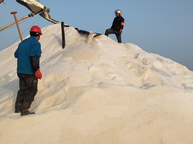3月3日,日曬制鹽埒南分公司5臺扒鹽機組全面響機收鹽,白色鹽田安全警示彩旗飄飄,破碴機穿梭往來,一片繁忙景象,收鹽機好似一條貪吃蛇,在鹽池里緩緩收鹽,大廩里一條白練傾瀉而下,堆砌成一座座銀山。