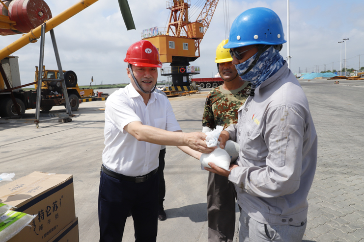 7月28日,投資公司黨委書記、董事長(zhǎng)李國(guó)文,黨委副書記王宏一行深入宵洋物流公司碼頭生產(chǎn)作業(yè)現(xiàn)場(chǎng),走訪慰問奮戰(zhàn)在一線的員工,為一線員工送上牛奶、綠豆等防暑降溫物品,在酷熱的夏日帶來絲絲清涼。