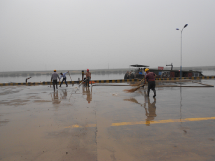 近期由于五灌河水位下降,給停靠碼頭的船只帶來了很大的安全隱患,于是公司決定對碼頭岸線的河道進行一次清淤工作,在清淤的運輸過程中使碼頭作業區一片狼跡,為了不影響宏港石化的PPA噸袋的吊裝業務,6月11日上午公司班子成員主動放棄休息日與上班工人一道對碼頭作業區進行清理,他們有的用水槍沖,有的用掃帚掃,經過二個多小時的奮戰,作業區場地上渙然一新。(宵洋葛高平)