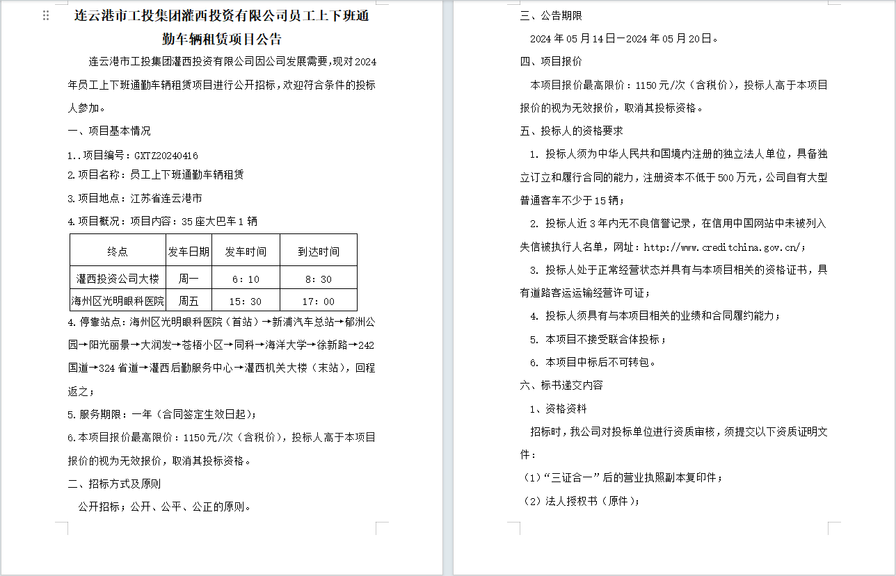 連云港市工投集團灌西投資有限公司員工上下班通勤車輛租賃項目公告