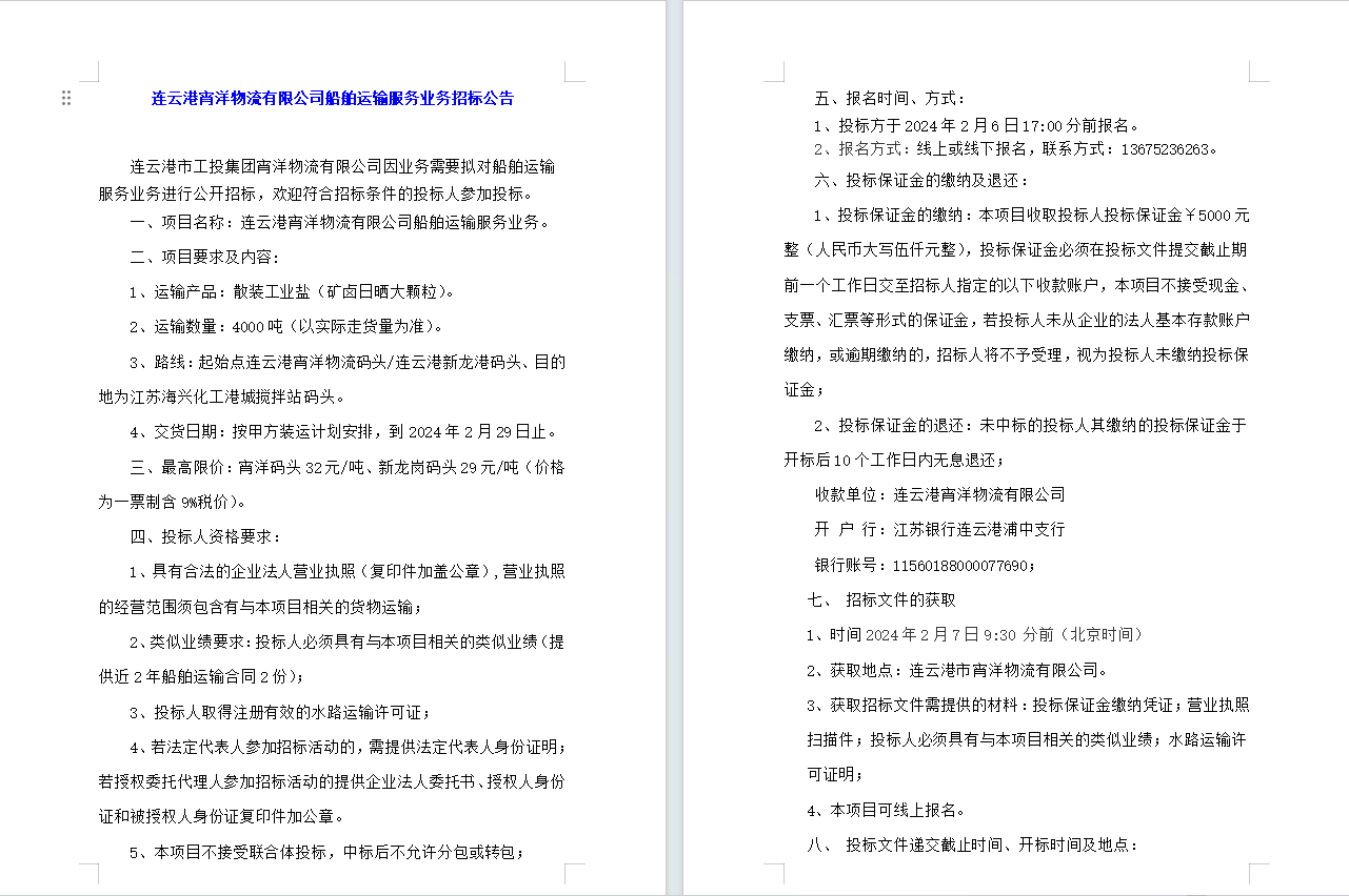 連云港宵洋物流有限公司船舶運(yùn)輸服務(wù)業(yè)務(wù)招標(biāo)公告