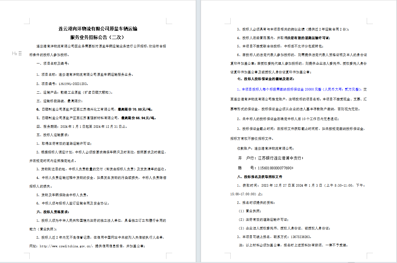 連云港宵洋物流有限公司原鹽車輛運輸服務業務招標公告(二次)
