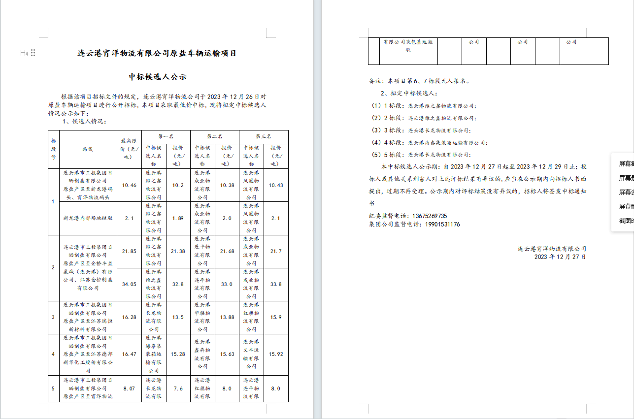 連云港宵洋物流有限公司原鹽車(chē)輛運(yùn)輸項(xiàng)目中標(biāo)候選人公示