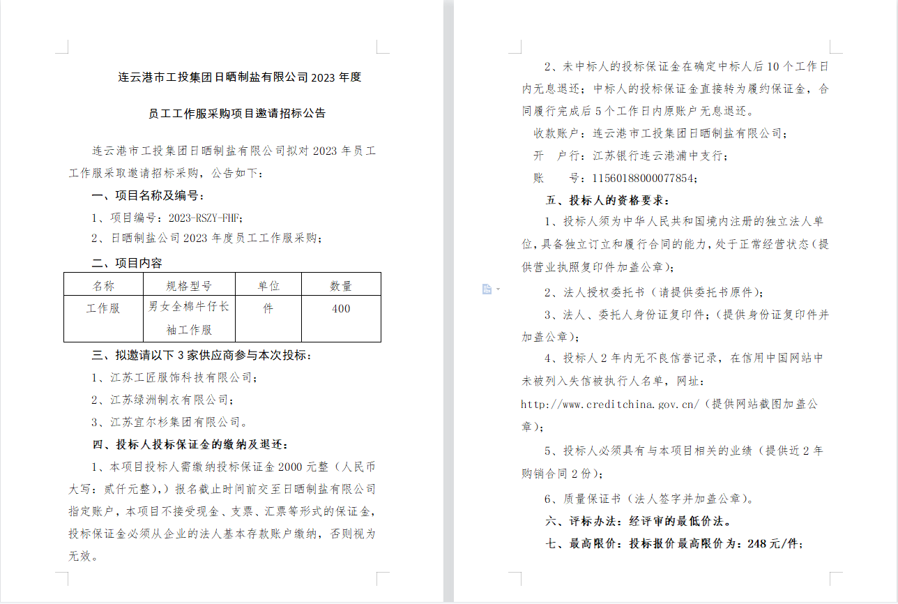 連云港市工投集團日曬制鹽有限公司2023年度員工工作服采購項目邀請招標公告