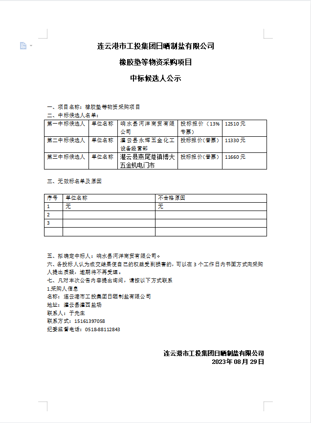 連云港市工投集團日曬制鹽有限公司橡膠墊等物資采購項目中標(biāo)候選人公示