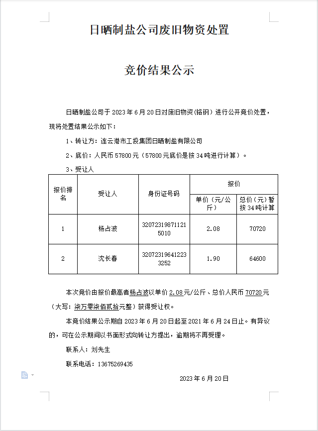 日曬制鹽公司廢舊物資處置競價結果公示