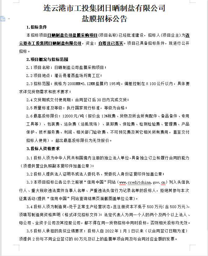 連云港市工投集團日曬制鹽有限公司鹽膜招標公告
