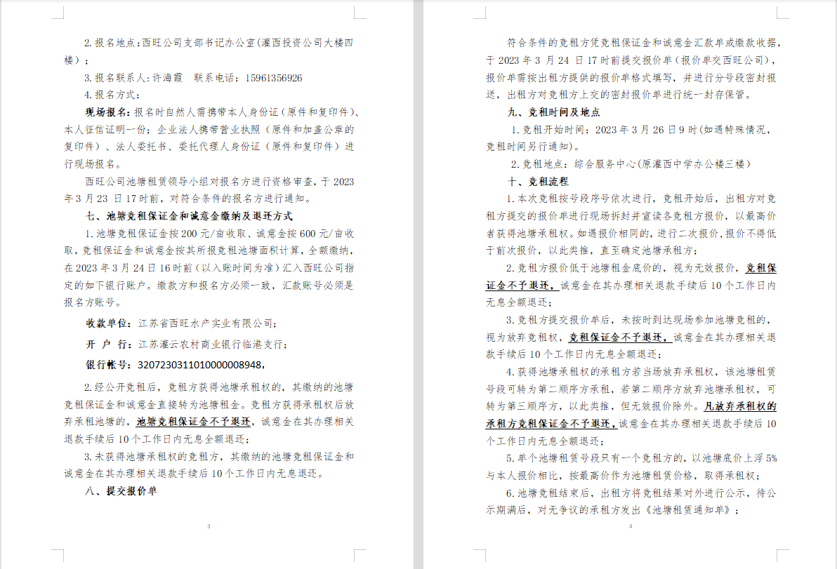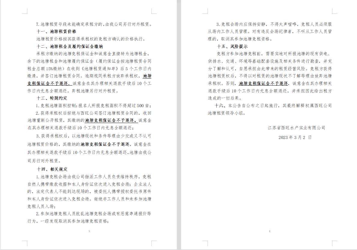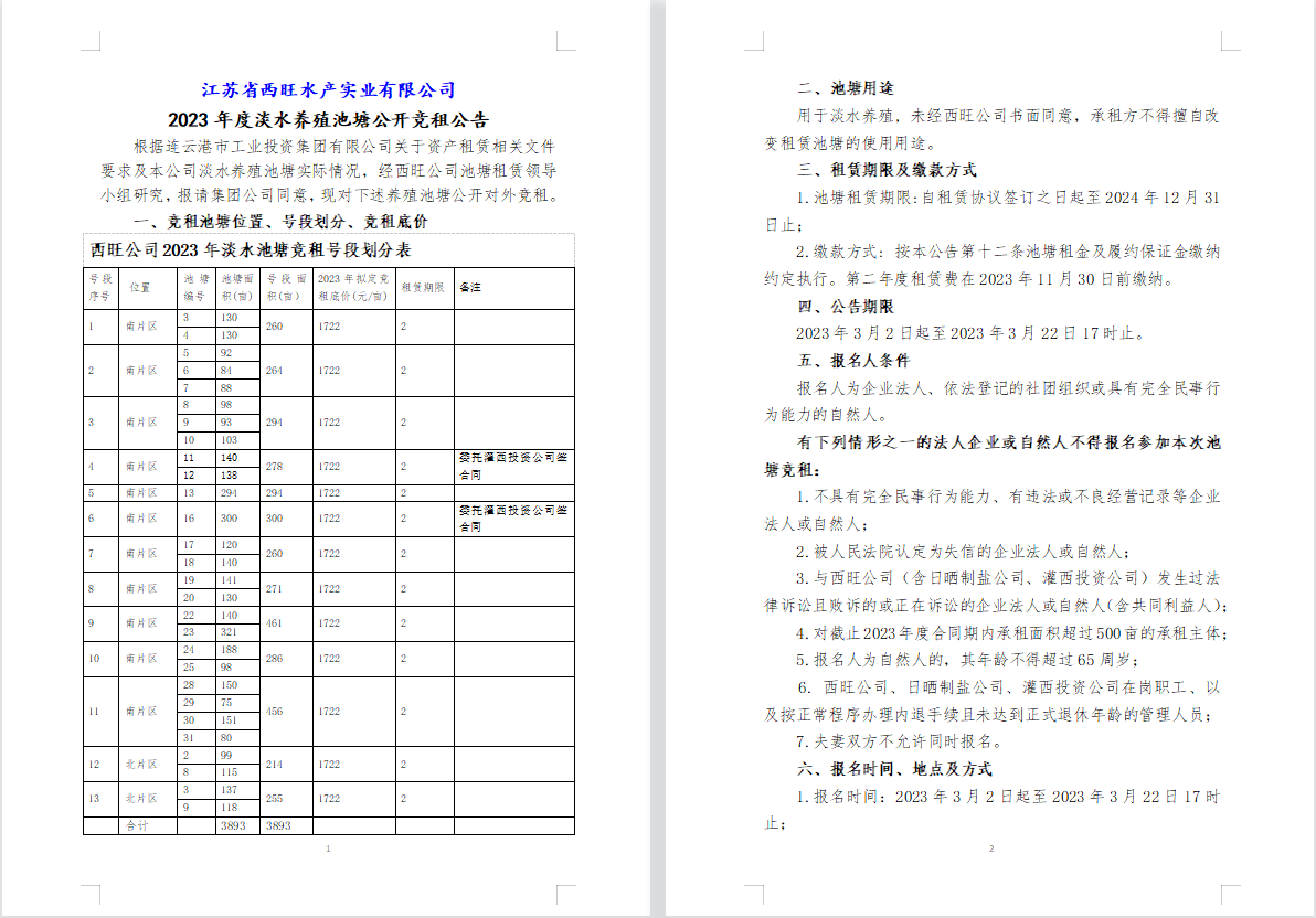 江蘇省西旺水產實業有限公司2023年度淡水養殖池塘公開競租公告