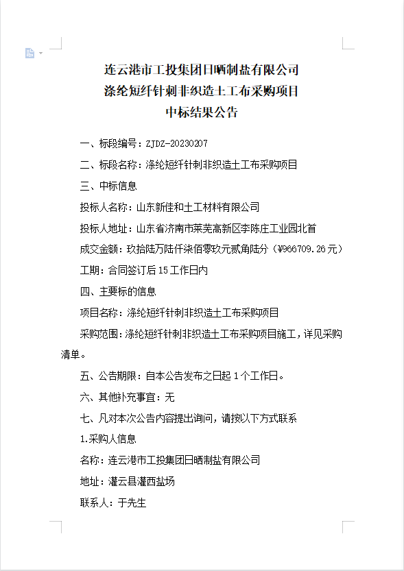 連云港市工投集團(tuán)日曬制鹽有限公司滌綸短纖針刺非織造土工布采購項目中標(biāo)結(jié)果公告