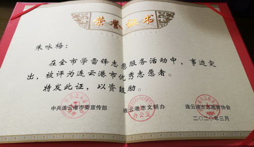 參加疫情防控志愿服務以來,朱詠梅一天都沒有休息,已為超過2萬名旅客檢測體溫。由于事跡突出,在全市學雷鋒志愿服務活動中,被評為連云港市優秀志愿者。工作期間,渴了不敢喝水,餓了就吃泡面,雖然很辛苦,但是她覺得很自豪,她說:“我是一名預備黨員,也是一名國企職工,比起那些奮戰在疫情防控一線的醫務人員,我做的太少了;當前,全國人民都投入到新冠肺炎疫情防控工作中來,我只是為防控工作貢獻了自己的微薄的力量,我相信只要我們團結一心、眾志成城,就一定能早日戰勝疫情,早日打贏這場沒有硝煙的戰爭!(凌家佳)