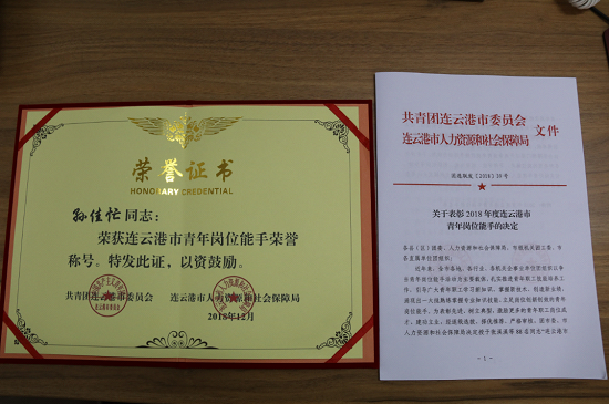 孫佳忙同志喜獲市“青年崗位能手”稱號