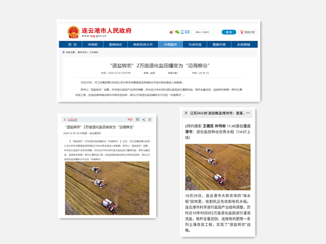 今年收割期間,人民網、光明網、江蘇24小時、連云港市人民政府網、連云港日報連續報道了我公司鹽堿地水稻豐收、秸稈綜合利用等工作舉措。我公司在現代農業發展和生態文明建設中取得的成就受到了媒體廣泛關注。(青宣)