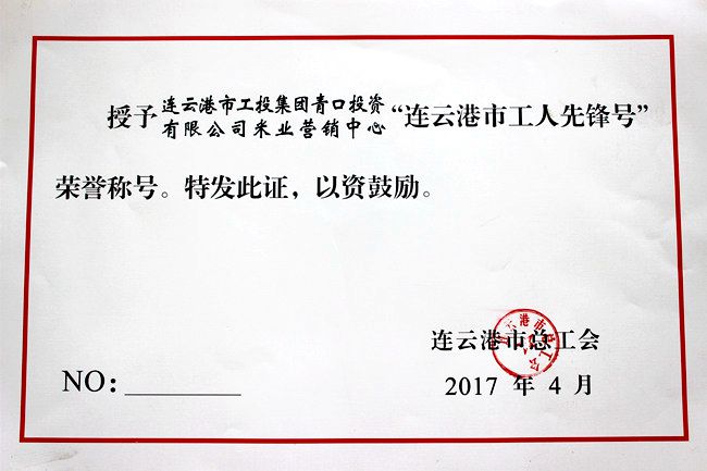 近日,公司米業(yè)營(yíng)銷(xiāo)中心在連云港市總工會(huì)組織的 “2017年度連云港市工人先鋒號(hào)”評(píng)選活動(dòng)中,被授予“工人先鋒號(hào)”榮譽(yù)稱(chēng)號(hào)。