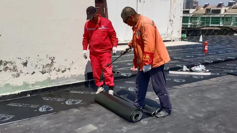 在昌圩湖大酒店樓頂防水工程施工現場,因屋面漏水嚴重影響酒店日常經營。為了趕在雨季來臨之前完成全屋面防水工程,節日期間,有著“臺北防水第一人”稱號的丁祥生班長帶領班組成員連日奮戰在施工現場。隨著噴槍烘烤著雨虹防水卷材,一米米的鋪設前進不斷縮短著距離。