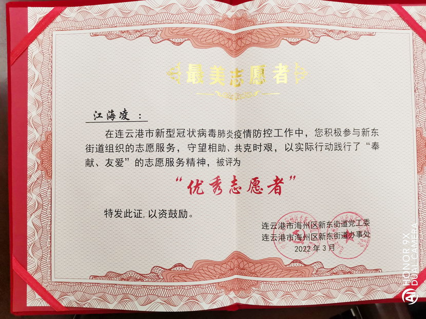 近日,港城成功戰(zhàn)勝新冠肺炎疫情,全市“摘星”轉(zhuǎn)為低風(fēng)險(xiǎn)地區(qū)。疫情發(fā)生以來(lái)一直奮戰(zhàn)在社區(qū)抗疫一線的黨員也收獲一份喜悅,紛紛被所服務(wù)街道、社區(qū)評(píng)為“最美志愿者”等榮譽(yù)稱號(hào),江海凌就是其中優(yōu)秀代表之一。