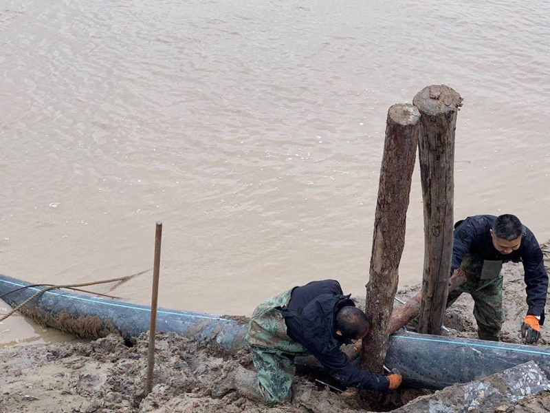 ?一想到昨天管道巡查到這里的情形,現(xiàn)在還讓人“心有余悸”!因管道地處善后河彎道處,常年的泄洪沖刮將河邊覆蓋管道的泥土沖刷卷走,使得岸邊泥土下原本穿越的PE315管道已經(jīng)暴露出來,退潮時的旋流不斷地沖撞著漂浮起來的鈣液管道,劇烈抖動著的管道不時發(fā)出“噗噗的低吼”隨時可能折斷。埒子口潮河段是鈣液東輸灌西管道最長的一節(jié)過河穿越,全長約300米。穿越管道如果折斷在河底后果將不可想象、經(jīng)濟損失也是不可估量的,這一幕讓在場所有人員都為之捏了一把汗!