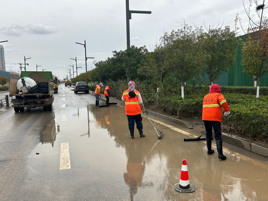 本次路線保障是今年以來最大規模任務,遵循每個重要現場必有安全員,必有班組長,必有機械設備”的要求,8個保潔班組,1個垃圾清運班組,1個清掃車隊,1輛鏟車,一層管理人員共160名職工全部出動。長達3天的路線保障中,清理落葉3.7噸,車輛行駛里程超1500公里,覆蓋防塵網近3000平方米,期間在開發區多次的突擊檢查中都能受到高度贊賞,為大合同簽訂再贏口碑。