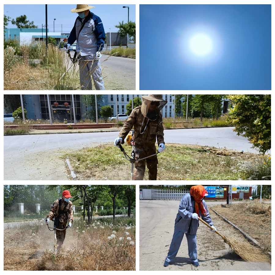 頭頂著炎炎烈日、忍受著蚊蟲叮咬,大伙使用打草機、鐮刀等工具,對雜草、高草進行割除。走近細看,他們的臉上和手臂上都布滿,衣服早已濕透貼在身上除草過程中,草渣紛紛濺到他們的身上,但這絲毫沒能影響他們工作的節奏。伴隨著機器的轟鳴聲,一片片規格一致、邊緣平直的綠草坪映入眼簾,淡淡的清香綠草味撲鼻而來,整個綠地充斥著整潔的氣息。