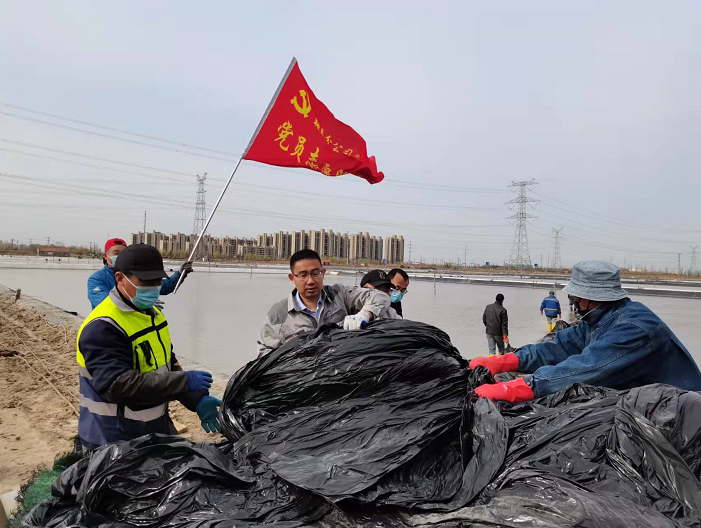 生產現場,一面面紅旗迎風招展,先鋒班組組長沈秀成駕駛拖拉機,載著塑布在壟道上來回穿梭,蕩起滾滾煙塵;兩大虎將劉天義、徐勇率領后勤人員將塑布卸到指定單元;退休黨員朱春年帶領兩個小組成員蹚進鹽池,將塑布上肩分別扛到東西堰擺放整齊;青年骨干夏軍班組成員負責塑布安裝,穿孔、打結,一氣呵成。同時,鹵水灌池與塑布安裝同步進行。所有人員在各自崗位上揮汗如雨、辛勤作業,忙而有序,現場呈現出一派熱火朝天的繁忙景象。