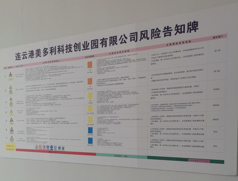 為進一步提升美多利公司安全管理水平,切實推行風險分級管控與隱患排查治理雙重預防機制試點工作。近日來,美多利公司組織全體員工開展雙重預防機制教育培訓。另外,對美多利公司消防泵房、特種設備等重點區域進行風險分級管控點檢,并對各個區域張貼崗位風險分級管控告知卡。