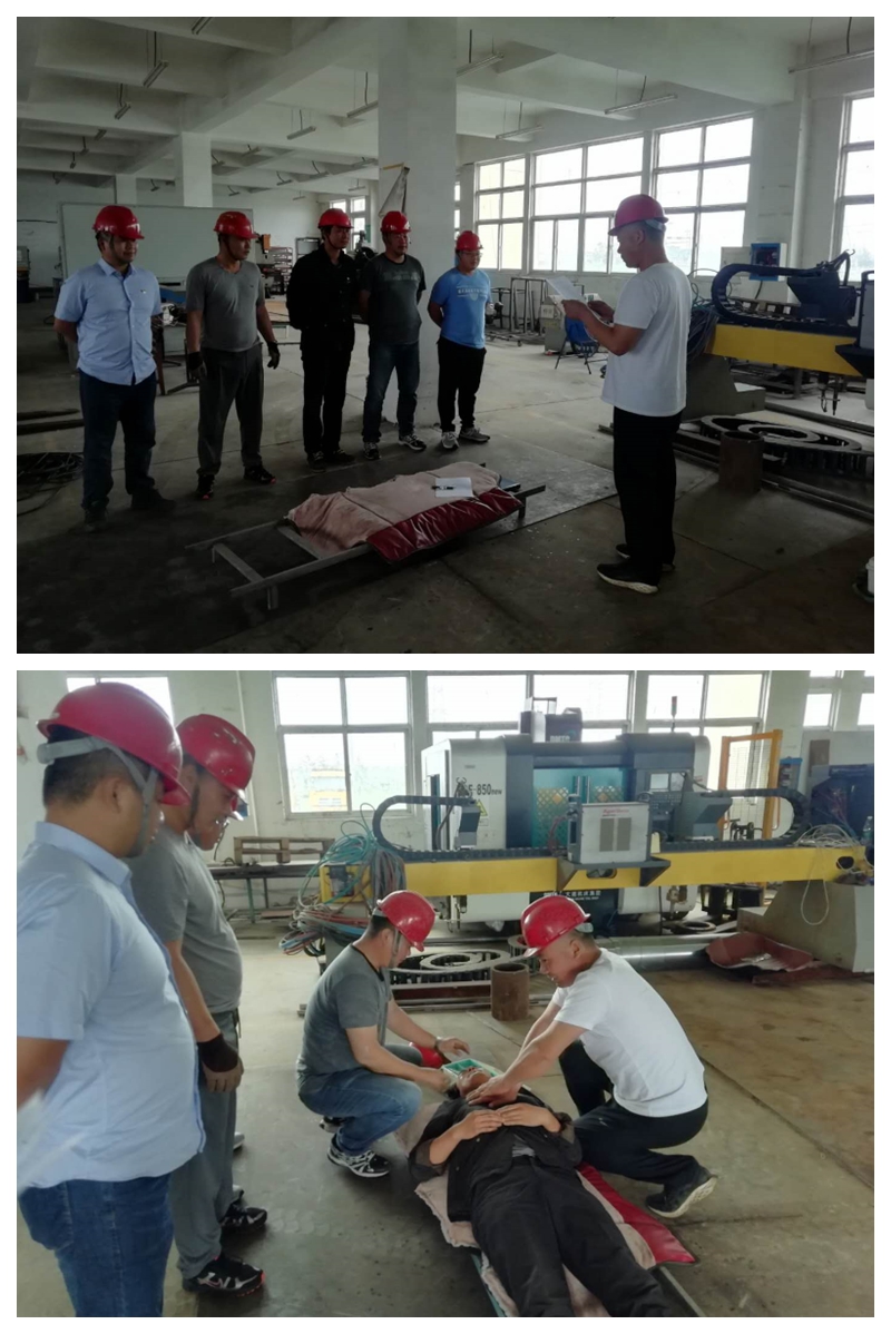 本次演練方案模擬在精工車間正常生產(chǎn)過程中,因?qū)﹄姎庠O(shè)備沒有經(jīng)常性檢查,液壓切板機(jī)切板時掉落的鋼板未采取防范措施將電氣電纜砸斷搭鐵,造成液壓切板機(jī)金屬外殼帶電,作業(yè)人員在正常操作機(jī)床時造成觸電事故傷害。當(dāng)同事發(fā)現(xiàn)有人觸電后,立刻做出救援反應(yīng),切斷電源將觸電人員安全隔離開后抬到擔(dān)架上進(jìn)行搶救。并同時上報應(yīng)救援指揮組,指揮組迅速做出響應(yīng),啟動防觸電應(yīng)急預(yù)案,大家按應(yīng)急預(yù)案的分工迅速開展救援工作,撥打120急救電話、拉警戒線、查看傷情、緊急搶救、人工心肺復(fù)蘇等,直至觸電者蘇醒,在大家的共同協(xié)作下演練圓滿成功,翔立分公司湯占國總經(jīng)理對此次演練效果進(jìn)行了總結(jié)和點(diǎn)評。