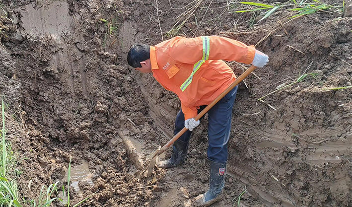 市政分公司組織搶修人員迅速到場,調(diào)集挖機(jī)與搶修材料,有序開展應(yīng)急搶修。維修人員首先對漏水管道實(shí)施開挖,經(jīng)過維修人員仔細(xì)挖開后確定直徑110PVC管道老化導(dǎo)致管道連接端裂開。查明原因后,制定了相應(yīng)可行的搶修方案。搶修過程中,大伙不畏困難、分工有序,相互協(xié)作,在滿是泥濘的坑中開展維修作業(yè)。機(jī)械開挖、人工配合清淤、更換損壞管道、增設(shè)哈夫節(jié)等一系列的步驟,一通操作下來,搶修人員人人汗流浹背。經(jīng)過3個多小時連續(xù)奮戰(zhàn),高效完成此次搶修任務(wù)。