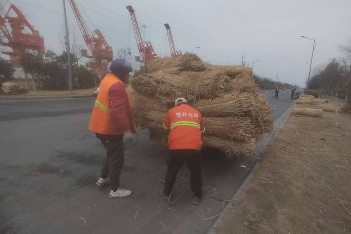 實時拆除防寒設施。隨著氣溫的逐漸升高,為使苗木更好、更快的返青,前期瑞南二個綠化班組緊鑼密鼓,積極準備,搶抓時機,3月中旬對云港路、金港路、228等道路兩側夾竹桃等綠植防寒草簾進行拆除工作,并對去冬枯枝干葉安排修剪。