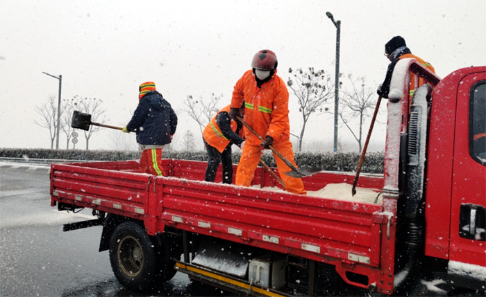 悅升公司按照責任分工,分包路段、分配任務,出動除雪機械設備,夜以繼日、奮戰(zhàn)一線,緊張有序地開展道路冰雪清除工作。本次出動保障人員160余名,兵分7路,2路裝卸隊負責將提前采購好的200多噸融雪劑有序裝車,5路道路保障隊負責各自區(qū)域內(nèi)的冰雪清除。保障人員克服地面濕滑、氣溫驟降等不利因素,秉承“減存遏增”的理念,各路段按照人工+機械的方式,采取“邊下雪邊除雪”的工作模式,共出動2輛雪輥車、4輛大雪鏟車、1臺撒播機、運雪皮卡和廂貨車共11輛,循環(huán)開展除雪作業(yè),各組之間配合默契,大大提高了工作效率。